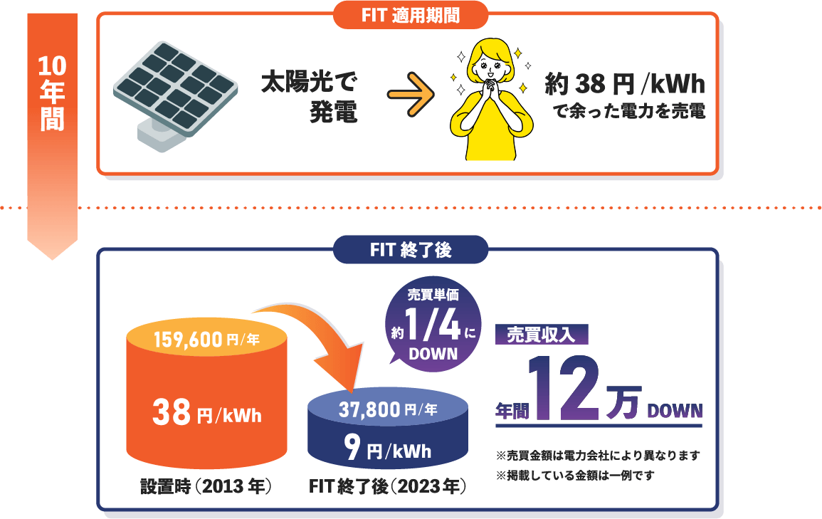 10年間の買取期間の終了後はFITが適用されなくなり、買取価格が大幅に低下することに。
